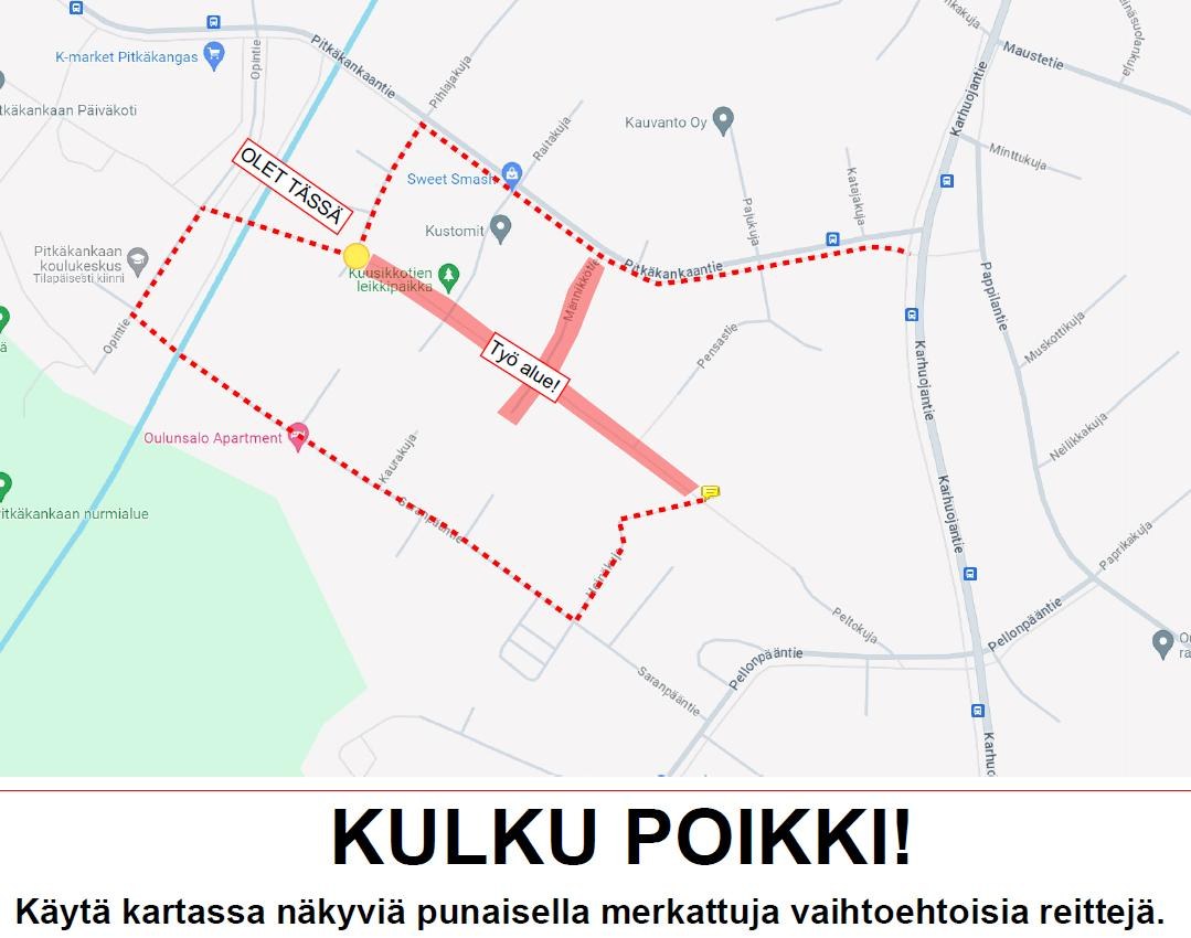 Katusaneeraustyöt alkavat Pitkäkankaan koulun lähiympäristössä Männikkötiellä sekä Metsäpolulla, myöhemmässä vaiheessa myös Lepikkotiellä. Metsäpolun kevyenliikenteenväylä katkaistaan pois käytöstä.