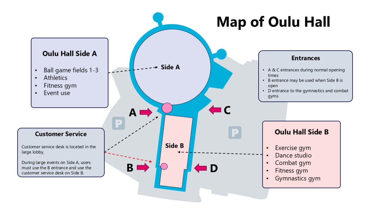 The service point closes one hour before the Oulu Hall closes. It is no longer possible to enter the Oulu Hall one hour before closing time. Exercise time ends 30 minutes before the Oulu Hall closes. Some events may restrict the use of exercise facilities.