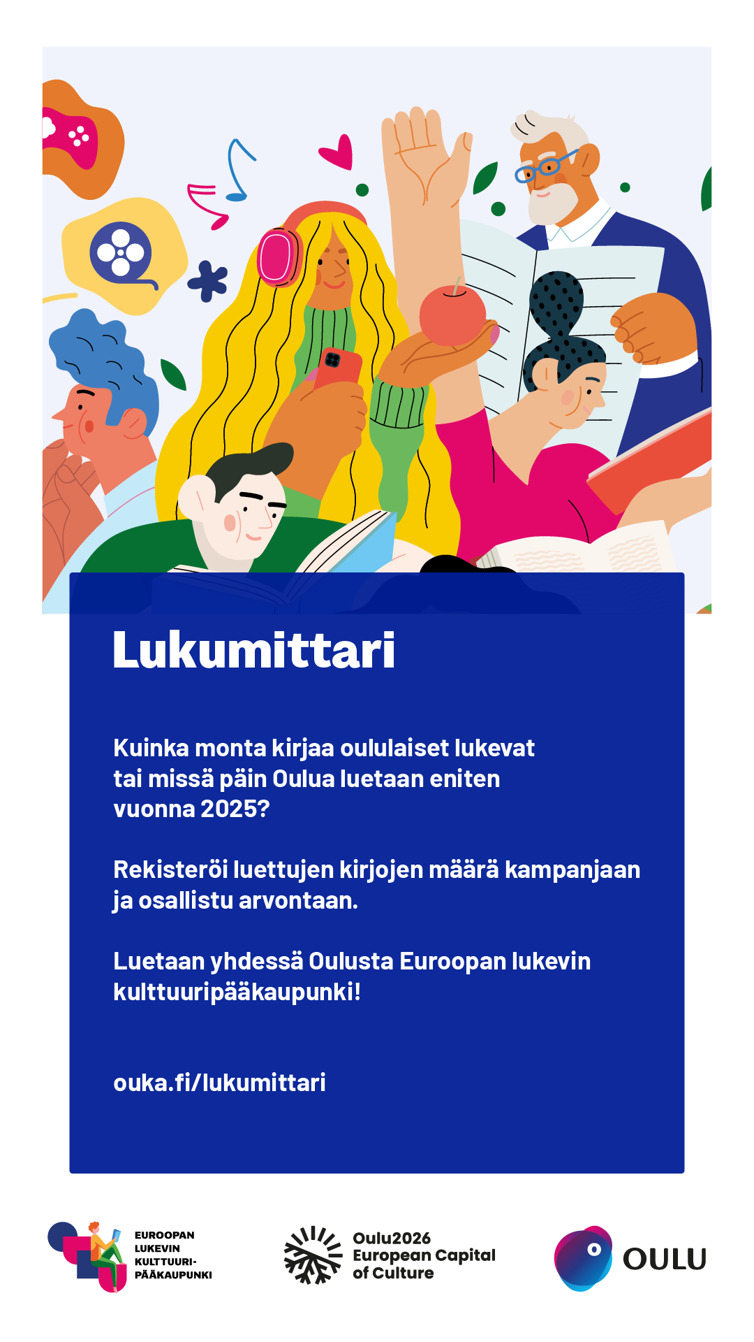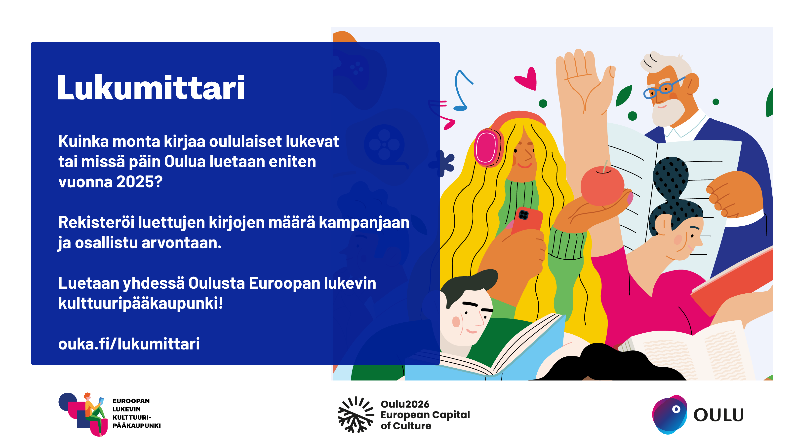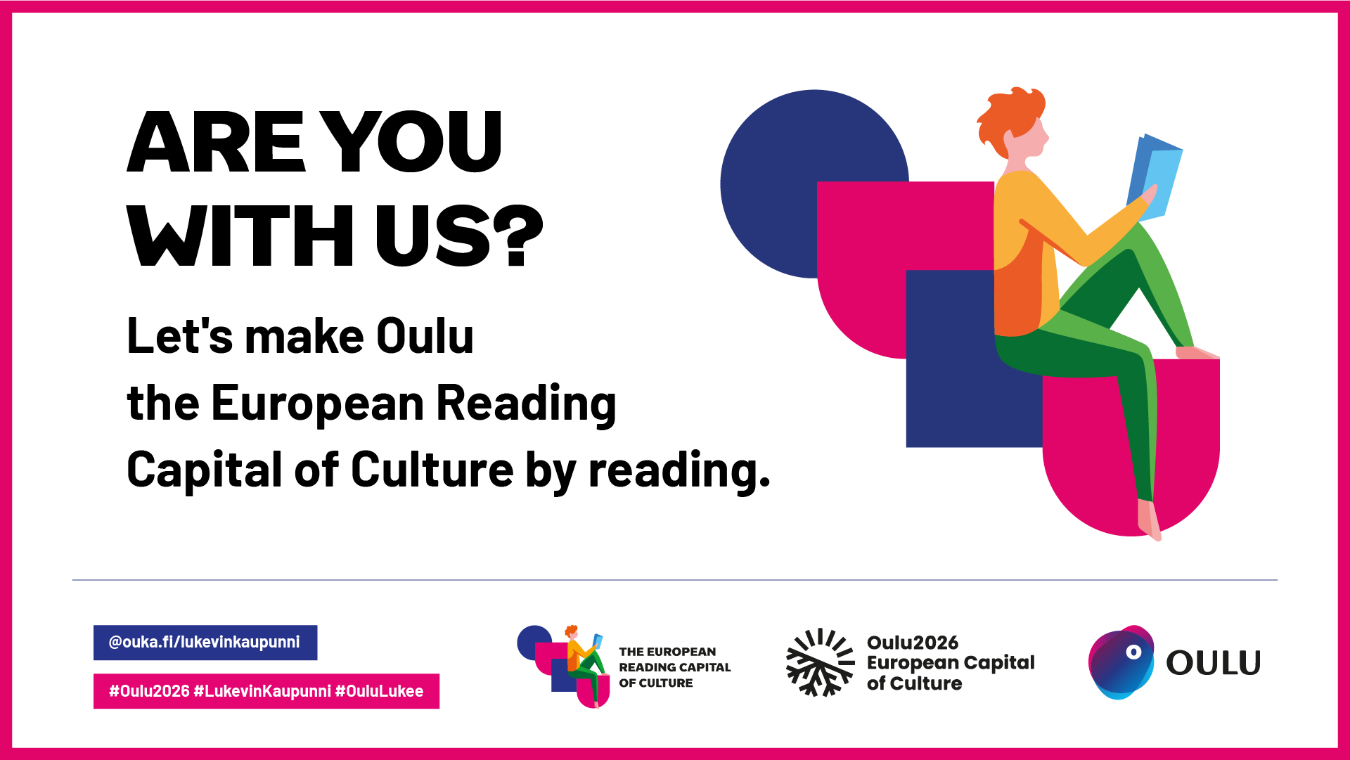 Use the hashtags #Lukevinkaupunni #OuluLukee #EuroopanLukevinKulttuuropääkaupunki #Oulu2026 and tag @oulunkaupunginkirjasto on social media.