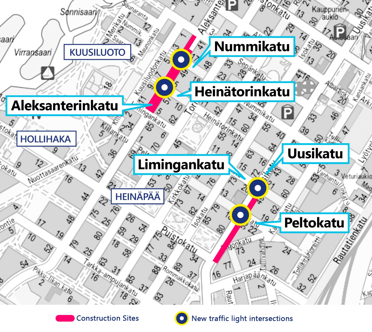 Four intersections without traffic lights on Aleksanterinkatu and Uusikatu will be altered to include traffic lights during the summer and fall. On Aleksanterinkatu, the construction focuses on the area between Limingankatu and Sepänkatu. The new traffic lights will be added to the intersections with Nummikatu and Heinätorinkatu. On Uusikatu, the construction will be done in the area between Puistokatu and Heinätorinkatu. On Uusikatu, the traffic lights will be added to the intersections with Limingankatu and Peltokatu.