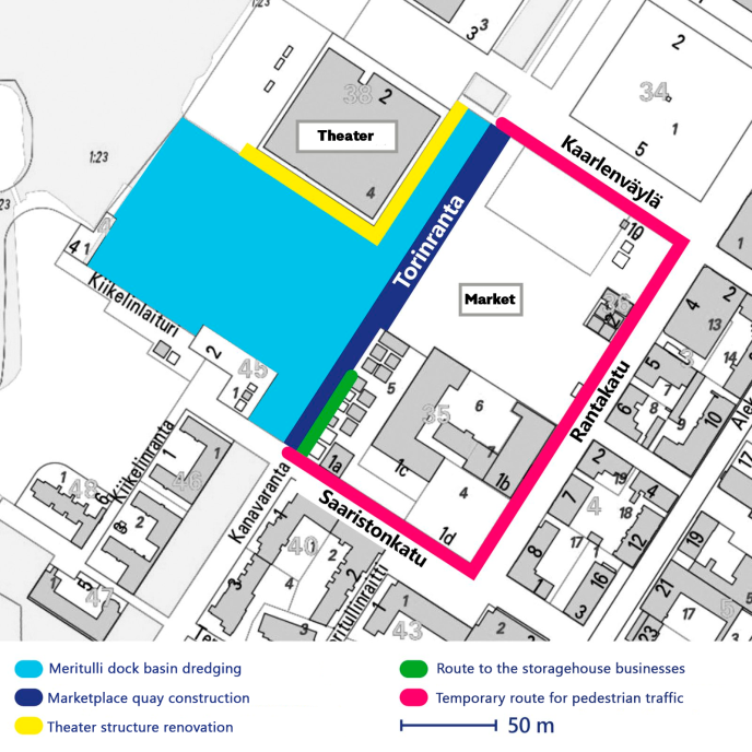 The quay’s renewal does not affect the operations of the marketplace. The marketplace will be active as normal in the summer of 2025. The shore route will be closed, however. Pedestrian traffic will be directed by a temporary route via Rantakatu. There will be a guided route to the storagehouse businesses along the shore from the Kiikeli Bridge.