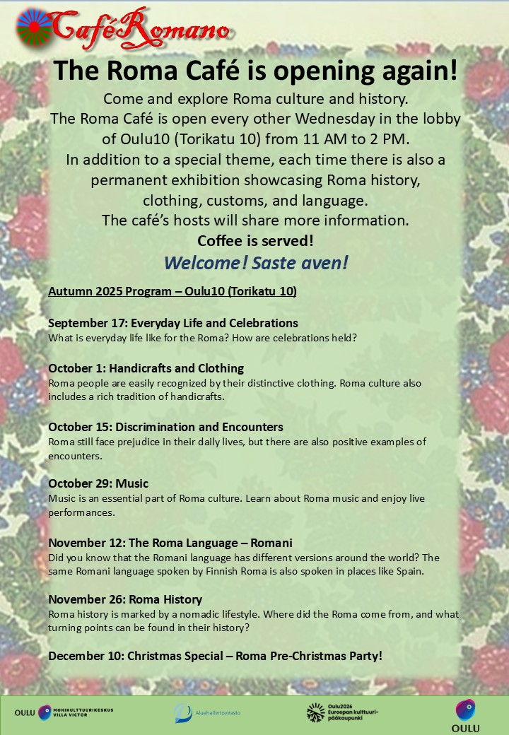 Starting September 17, every other Wednesday the Roma Café offers coffee and insights into Roma people – their culture in general and related topics.