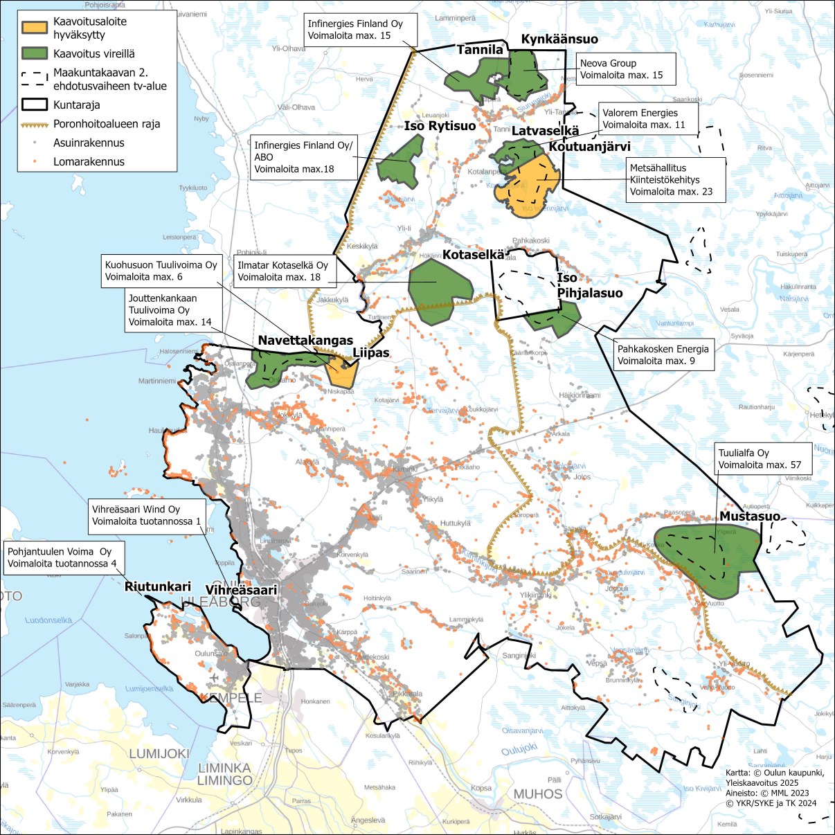 Oulussa on vireillä tai käynnistynyt useita seudullisen kokoluokan tuulivoimahankkeita. Rakentuneita voimaloita on ainoastaan Oulunsalon Riutunkarissa 4 kappaletta ja Vihreäsaaressa yksi. Seudullisella kokoluokalla tarkoitetaan vähintään 10 voimalan hanketta, jolloin maakuntakaava ohjaa suunnittelua. Pohjois-Pohjanmaalla on vireillä energia- ja ilmastovaihemaakuntakaava, jonka toisen kuulemisvaiheen ehdotus on ollut nähtävillä alkuvuodesta 2025. Kaavaehdotus hyväksytään tavoitteen mukaan toukokuussa 2025. Vaihemaakuntakaava pohjautuu tuulivoiman osalta kattaviin TUULI-hankkeessa tehtyihin selvityksiin.