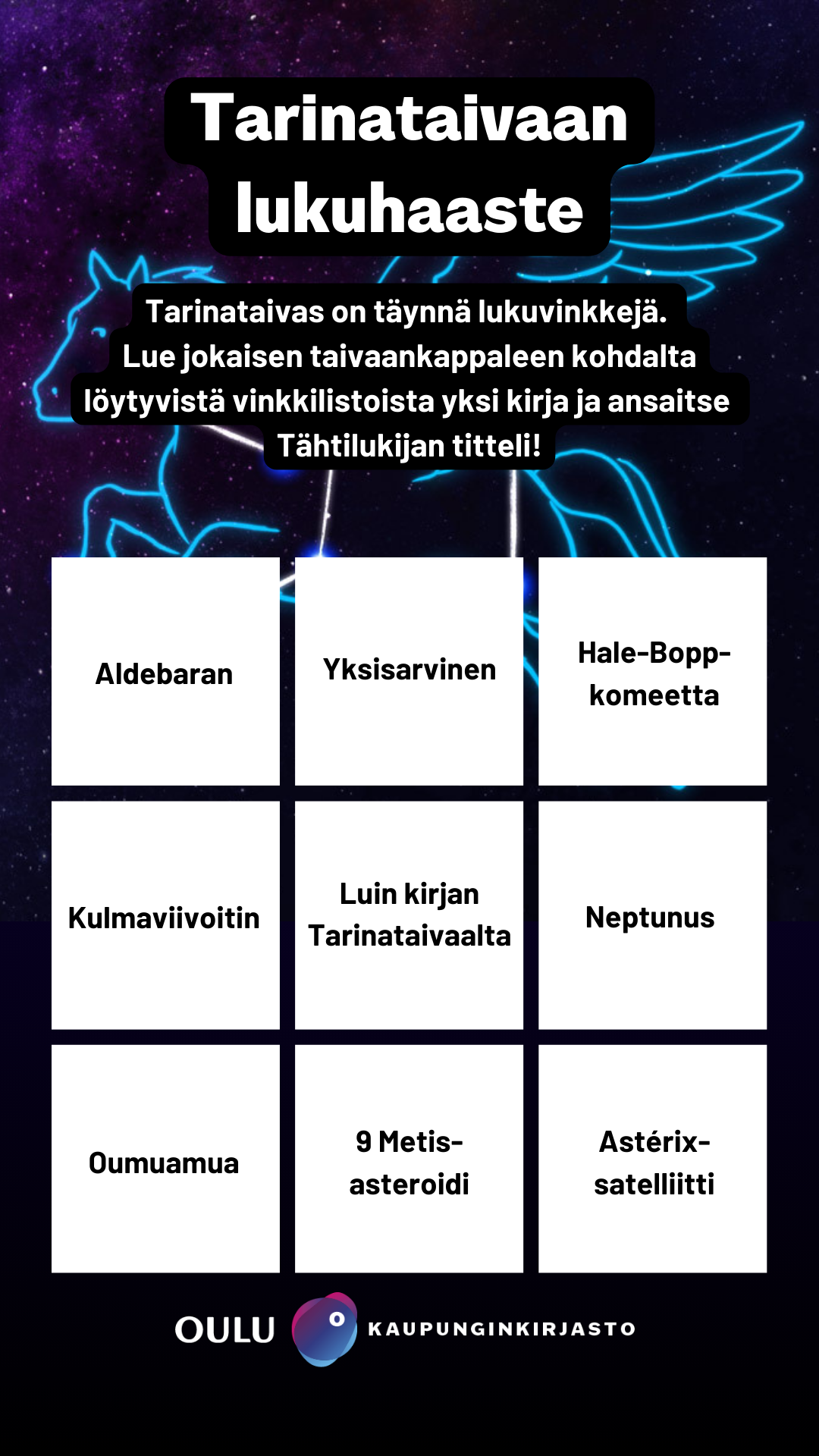 Voit haastaa itsesi lukemaan Tarinataivaan lukuhaasteen. Lue jokaisen taivaankappaleen kohdalta löytyvistä vinkkilistoista yksi kirja. Täyttämällä jokaisen haastekohdan ansaitset itsellesi Tähtilukijan tittelin!