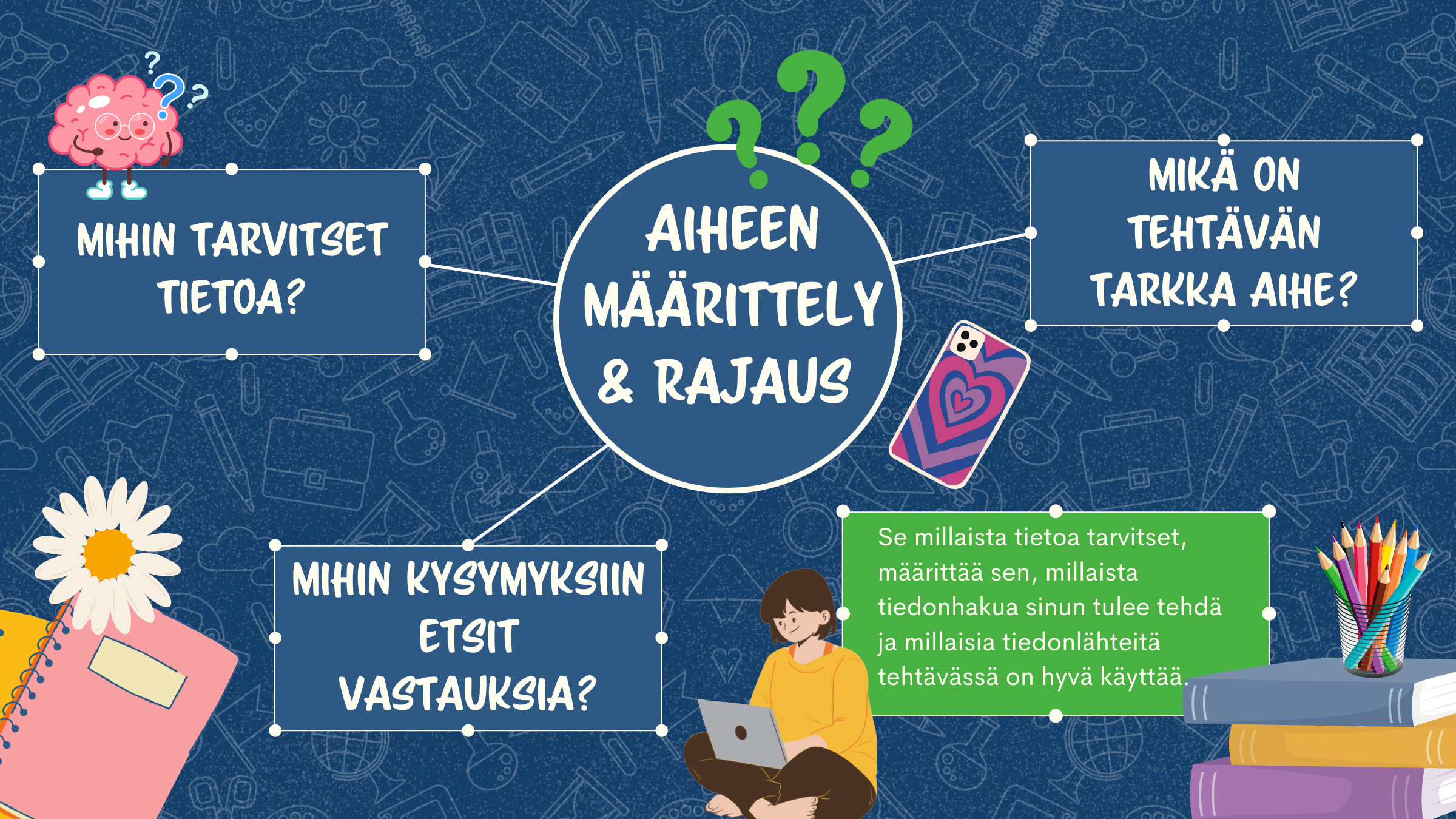 Kun olet tekemässä opiskelutehtävää, esimerkiksi tutkielmaa tai esseetä, on ensimmäinen ja tärkein asia aiheen määrittely ja rajaus. Tämä on myös tiedonhankinnan ensimmäinen vaihe.