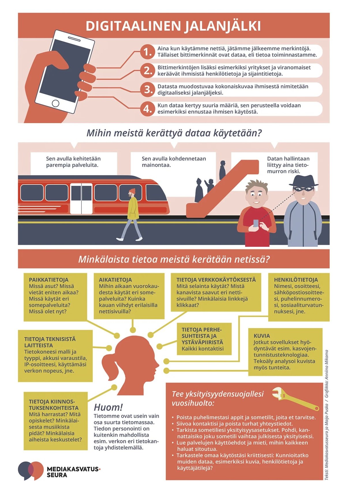 Tutki alla olevaa Digitaalinen jalanjälki -julistetta (avaa kuva koko näytön kokoisena). Infograafi on Mediakasvatusseuran tuottama ja se on julkaistu lisenssillä CC BY-NC-ND. Kuvan tekstivastine löytyy Mediakasvatusseuran sivuilta.