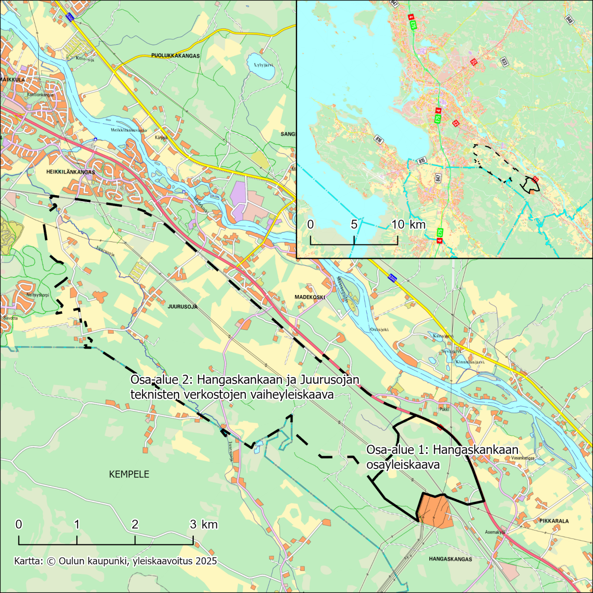 2) Hangaskankaan ja Juurusojan teknisten verkostojen vaiheyleiskaavan alue – osalle aluetta suunnitellaan Oulun teollisuusalueita palvelevia teknisiä verkostoja