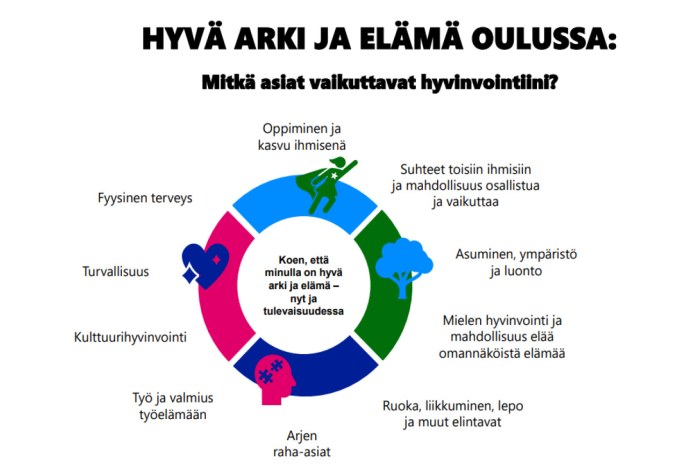 Hyvinvointi Kirjasto Kulttuuri Liikunta Luonto ja ulkoilu Tapahtumat Eri elämäntilanteisiin sopivia sivuja Lapset ja lapsiperheet Nuoret Opiskelijat Ikääntyneet Maahanmuuttaneet ja vieraskieliset Etsikö näitä? Hyvinvoinnin edistäminen Ehkäisevä päihdetyö Elämänkaariverkostot Hyvinvoinnin edistämisen avustukset Hyvinvoinnin edistämisen tiimi Hyvinvointisuunnitelma ja -kertomus Yhteisötoiminta ja yhteisötilat Asuinalueesi palvelut Asumiseen liittyviä huolia? Asumisneuvonta auttaa! Hyvinvoinnin hankkeet Virkeästi arjessa -ryhmätoimintaa ikäihmisille Nuorten navigaattori - ehkäisevää päihdetyötä Prikka kiertoon -hanke | hdl.fi Vapaaehtoistoiminnalla yhdenvertaiseen osallisuuteen Hyvinvointia edistävää toimintaa Alueelliset hyvinvointiverkostot ja idearaha Osallistuva budjetointi Puistoruokailu Lähekkö nää luontoon -toimintaa Yhteisövaikuttavuus - Moniammatillista verkostotyötä Hyvinvointikertomus 2021-2025 Asukkaiden hyvinvoinnin ja terveyden edistäminen on kaupungin tärkein tehtävä, joka sisältyy kaikkiin lakisääteisiin tehtäviin. Hyvinvointikertomus kokoaa eri lähteistä tietoa oululaisten terveydestä ja hyvinvoinnista sekä niihin liittyvistä tekijöistä ja muutoksista viime vuosien ajalta. Tutustu hyvinvointikertomukseen Pohjois-Pohjanmaan hyvinvointialue Pohteen palvelut Pohde järjestää oululaisille sosiaali- ja terveyspalvelut sekä pelastuspalvelut. Tutustu Pohteen palveluihin Reittis Pohteen Reittis-sivustolta löydät monipuolista tietoa hyvinvointisi tueksi. Sivuille on koottu Oulun ja muiden alueen kuntien ja järjestöjen hyvinvointia tukevia palveluja ja tapahtumia. Reittis-sivusto on suunniteltu tukemaan ja ohjaamaan hyvinvoinnin tiellä. Hyvinvointi on läpi elämän muuttuva matka, jonka varrella voit tarvita opastusta. Pienelläkin askeleella voi olla suuri vaikutus hyvään arkeen ja mielekkääseen elämään. Tutustu Reittikseen Lähellä.fi Järjestöt ja yhdistykset tarjoavat apua ja tukea erilaisissa, haastavissakin elämäntilanteissa. Järjestöjen kautta voit saada ammattiapua tai vaikkapa vertaistukea. Järjestöt tarjoavat myös mahdollisuuden mielekkääseen toimintaan ja osallistumiseen vapaa-aikana. Lähellä.fi kokoaa yhdistysten ja järjestöjen tuen, toiminnan ja tapahtumat yhdelle sivustolle. Voit hakea oululaisille suunnattua toimintaa ja tapahtumia Oulu-hakusanalla. Hae yhdistysten toimintaa Uutisia – vapaa-aika ja hyvinvointi 19.12.2025 Lastenkulttuurikeskus Kotilo ja MLL Pohjois-Suomen piiri vahvistavat lapsiperheiden hyvinvointia yhteistyöllä 19.12.2025 Urheiluseurojen tila-avustus haussa tammikuussa, terveysliikunnan tapahtuma-avustukseen jatkuva haku 18.12.2025 Joulun aika, uusivuosi ja loppiainen vaikuttavat liikuntapaikkojen aukioloaikoihin 18.12.2025 Hyvinvointisuunnitelman valmistelu etenee laajassa yhteistyössä – kolmas sektori aktiivisesti mukana 17.12.2025 Joulupostia ikäihmisille -kampanja keräsi 2050 joulukorttia Oulussa 17.12.2025 Terveyskuntomittauksia tehdään Oulussa, Haukiputaalla ja Kiimingissä tammikuun toisella viikolla 16.12.2025 Raksilan alueella useita tapahtumia lauantaina 20.12. 16.12.2025 Keskustakirjasto Saaren Digiverstas on avattu Katso kaikki kaupungin uutiset Oulussa tapahtuu Poimintoja Pohteen tapahtumakalenterista