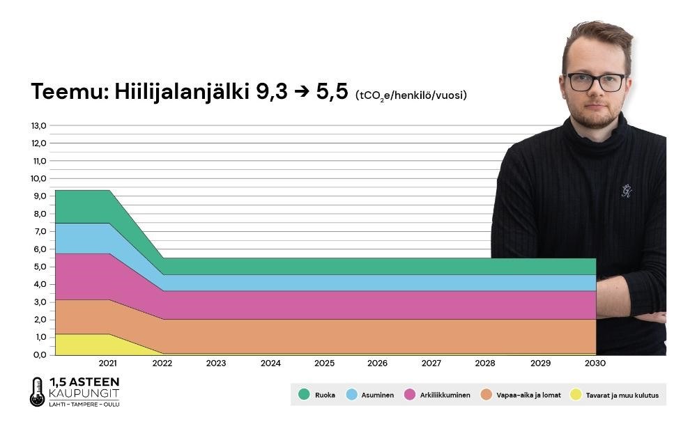 Elämäntapamuutosten avulla Teemu voi vähentää hiilijalanjälkeään 3,8 tonnilla. Näin hänen hiilijalanjälkensä olisi 5,5 tonnia. Vuoden 2030 1,5 asteen ilmastotavoitteen mukainen taso on 2,5 tonnia.
