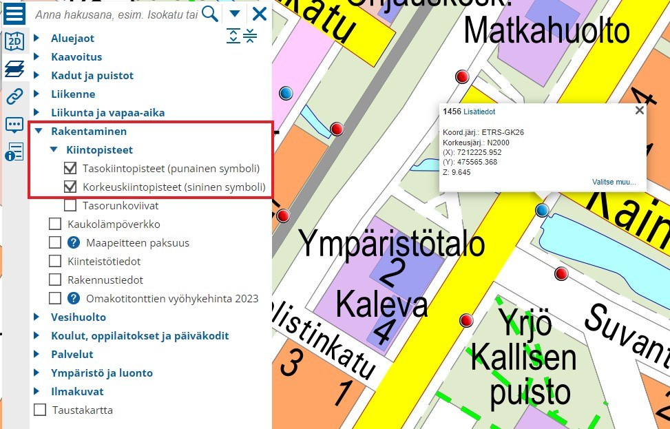Kiintopisteiden tiedot löytyvät Karttatieltä, valitse Kartalla näytettävät tiedot -kohdasta Rakentaminen. Valitse kartalta haluamasi piste ja klikkaa kyseisen pisteen Lisätiedot -linkkiä, josta avautuu tulostettava sivu.