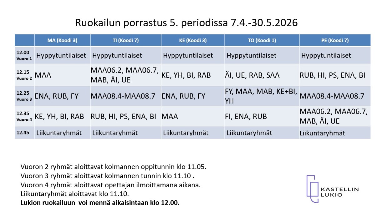 Kastellin tuntikaavio poikkeaa muista Oulun lukioista, koska urheilulukiolaiset käyvät aamuisin valmennuksessa. Kolmas tunti on porrastettu ruokailun vuoksi ja se alkaa klo 11.05 tai 11.10 tai 11.20. Liikuntatunnit alkavat klo 11.10.