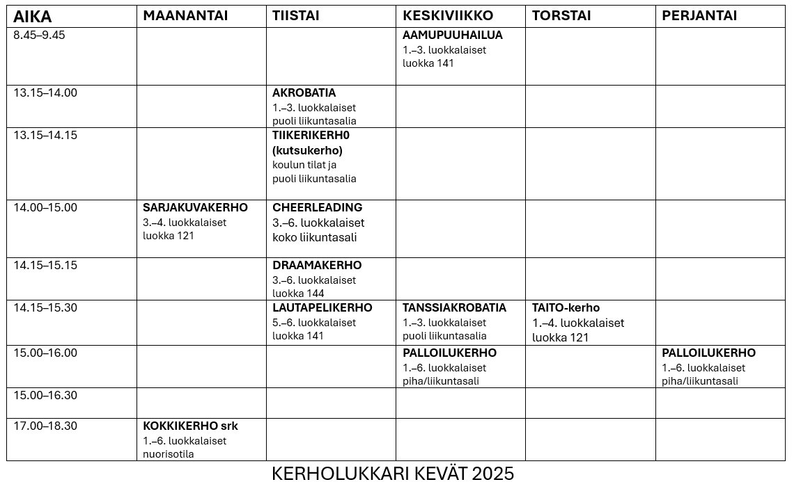 Koulumme syksyn 2025 kerhot näet alla olevasta kuvasta.
