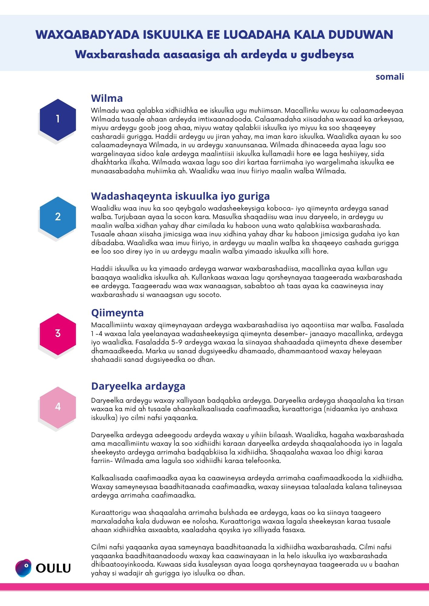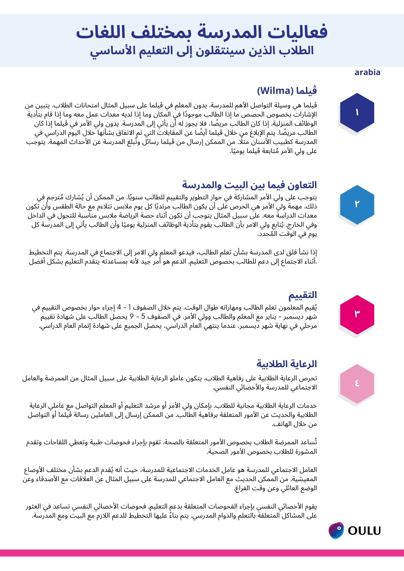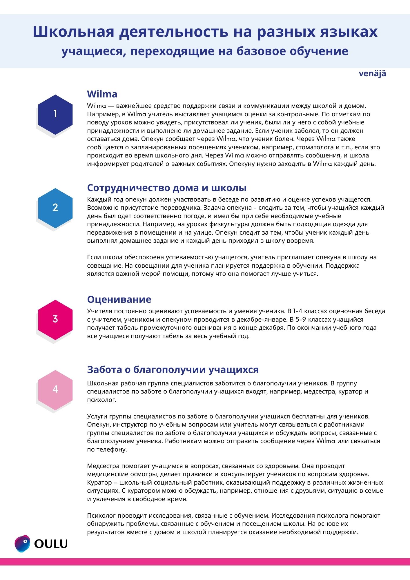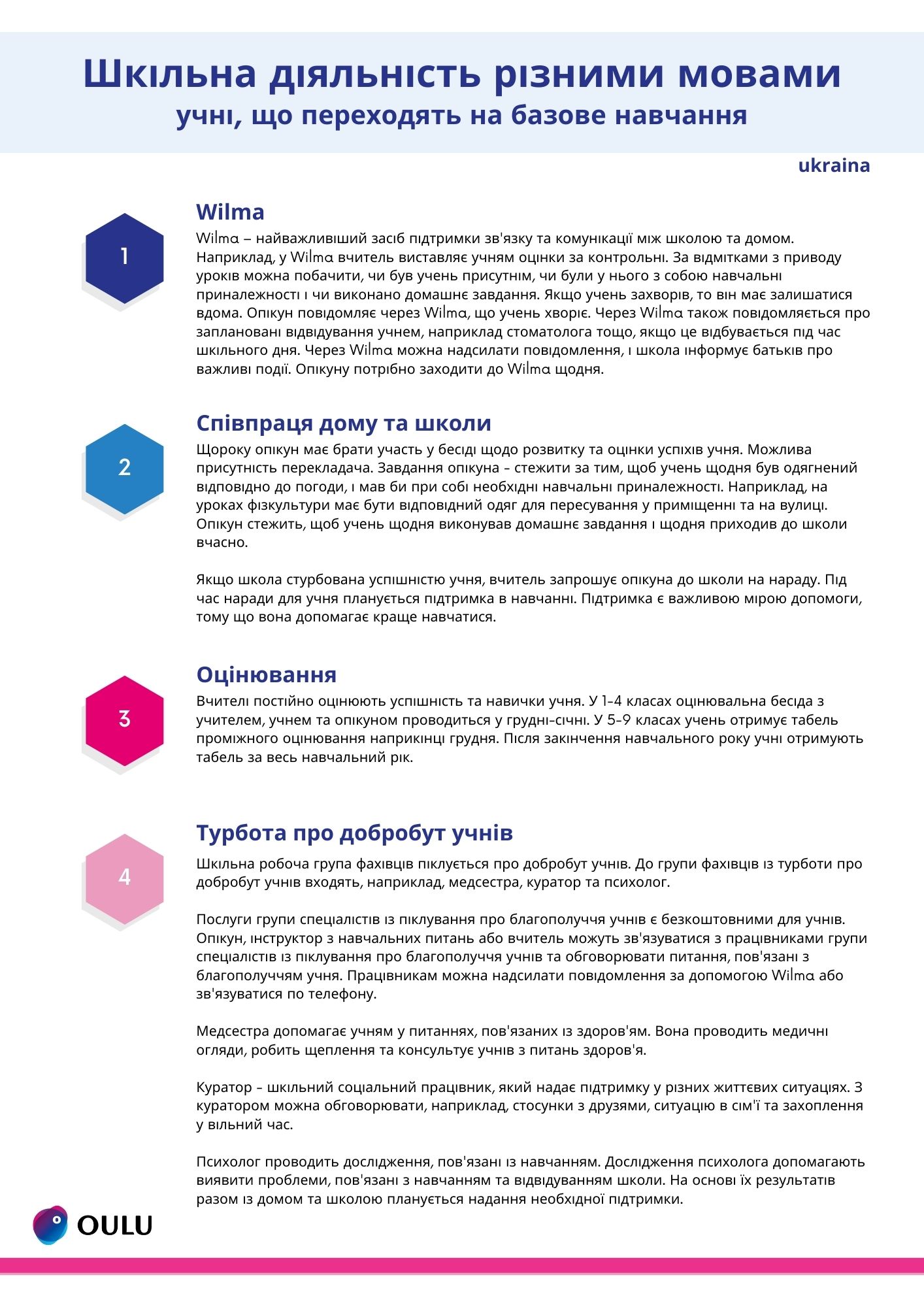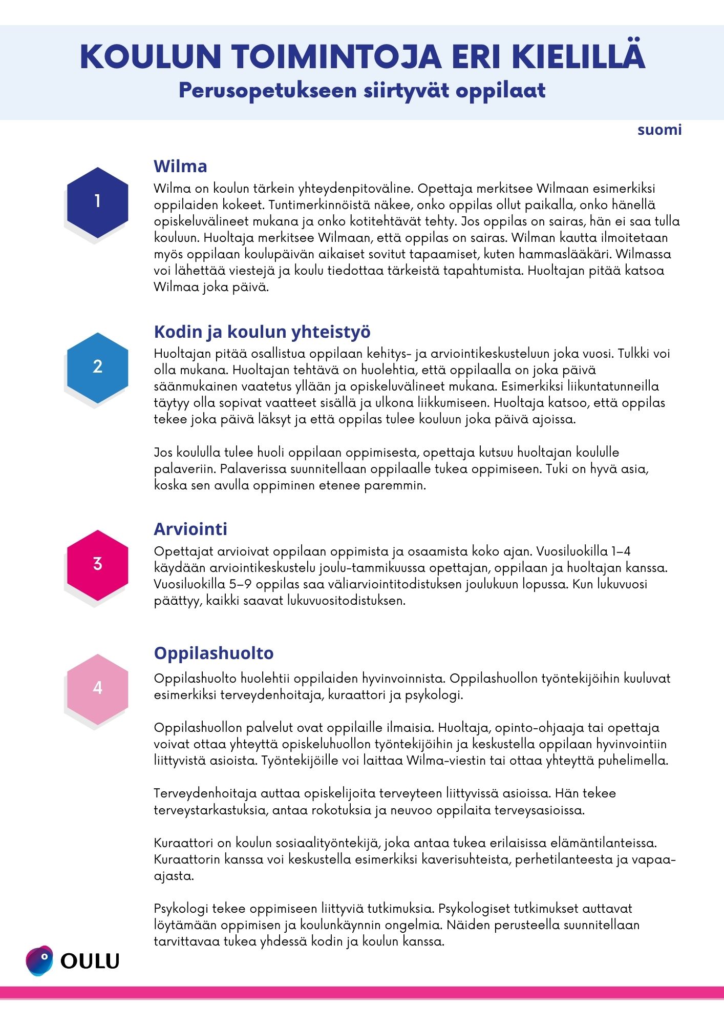 Koulussamme on monia käytänteitä, joista olemme koostaneet ohjeet eri kielille. Ohjeissa kerrotaan wilmasta, kodin ja koulun yhteistyöstä, arvioinnista sekä oppilashuollosta. Ohjeet on käännetty arabiaksi, mandariinikiinaksi, somaliksi, suomeksi, ukrainaksi ja venäjäksi. Ohjeet eri kielillä löydät alla olevista linkeistä.