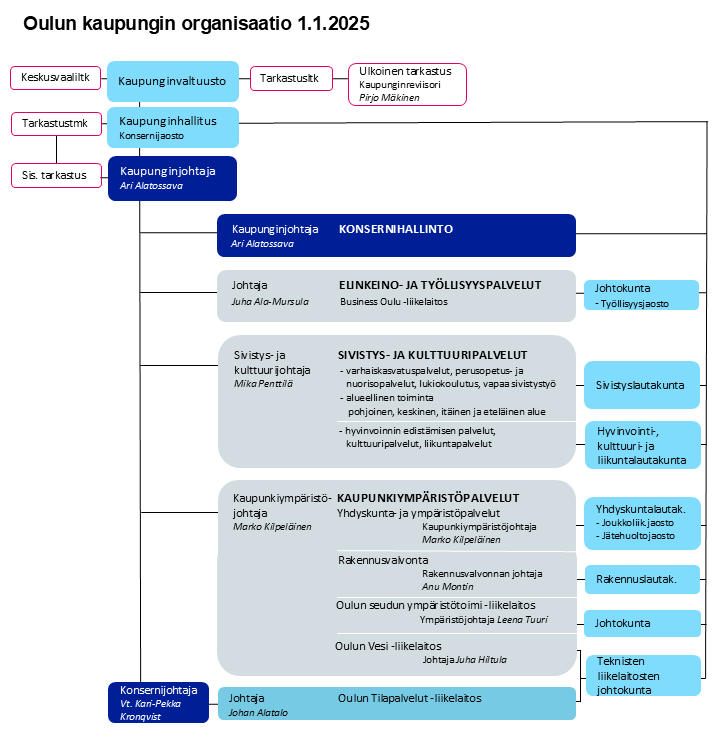 Oulun kaupungin organisaatiokaavio. Kaaviota voi tarkastella suuremmassa koossa kuvan yläpuolella olevan pdf-tiedoston kautta.