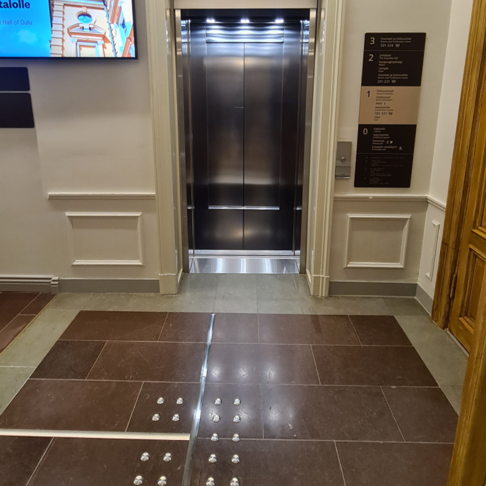 - Tilassa on hissi, johon mahtuu pyörätuoli ja jonka ovi aukeaa automaattisesti. Hissin kerrosnumerot ovat sormin tunnusteltavissa. Uloskäyntikerroksen painike erottuu muista. (Esteettömän hissin vähimmäismitat ovat leveys 1,1 m ja syvyys 1,4 m.)