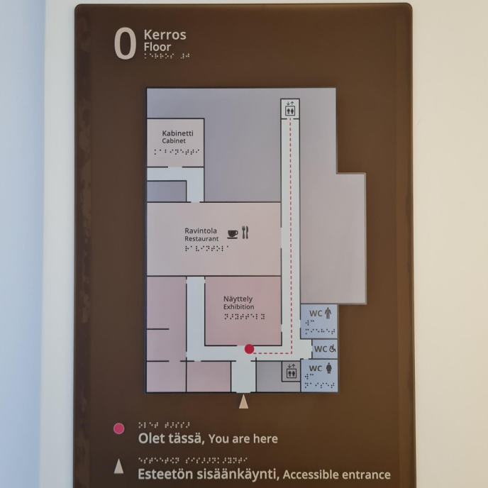 - Esteettömältä sisäänkäynniltä on opasteet hisseille ja hisseiltä edelleen infopisteelle ja kokoontumistiloihin.