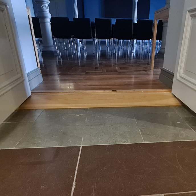 Kerroksen tiloissa olevat viistetyt kynnykset ovat enintään 20 mm korkeita. Kuvassa näkyvä kynnys on 1. kerroksen valtuustosalin ovelta. Kaupungintalon 2. kerroksessa sijaitsevat juhlasali, juhlasalin lämpiö sekä aulatila, joissa on enintään 20 mm viistetyt kynnykset.