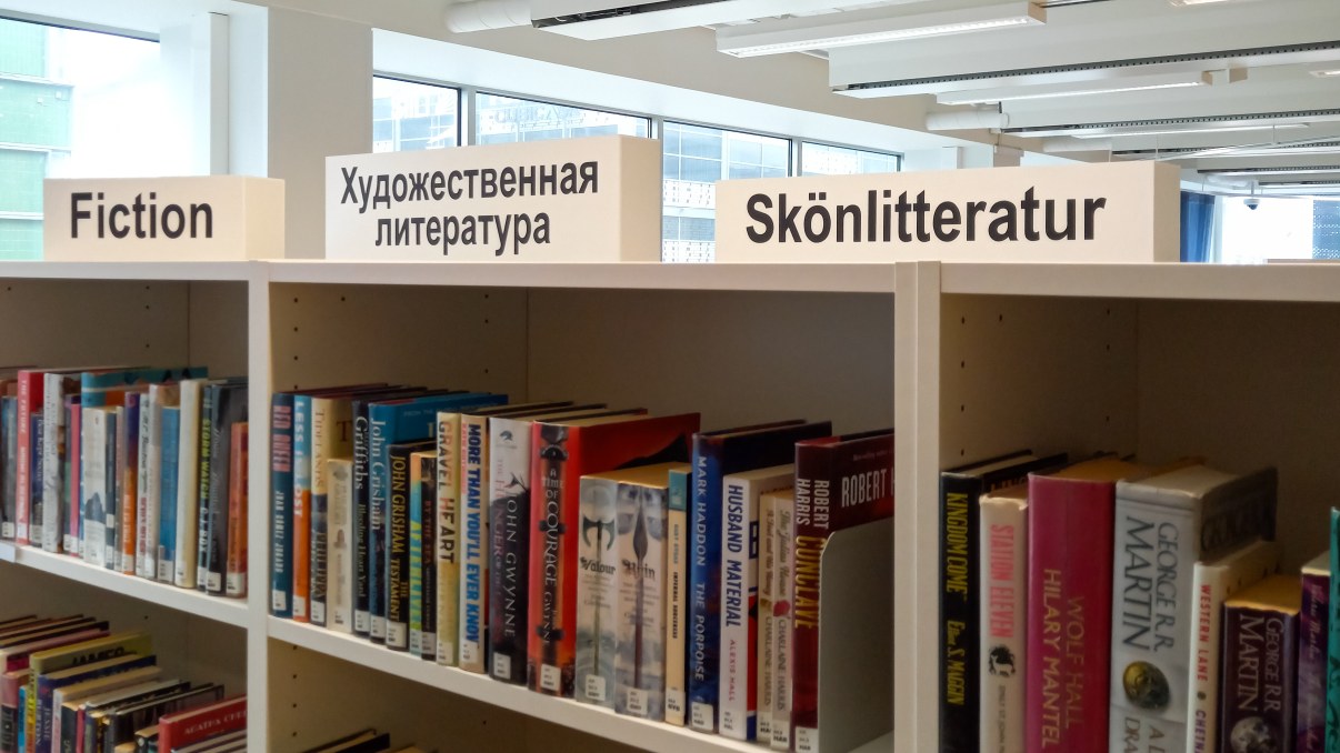 Kirjaston käyttösäännöt suomeksi, englanniksi ja ruotsiksi.