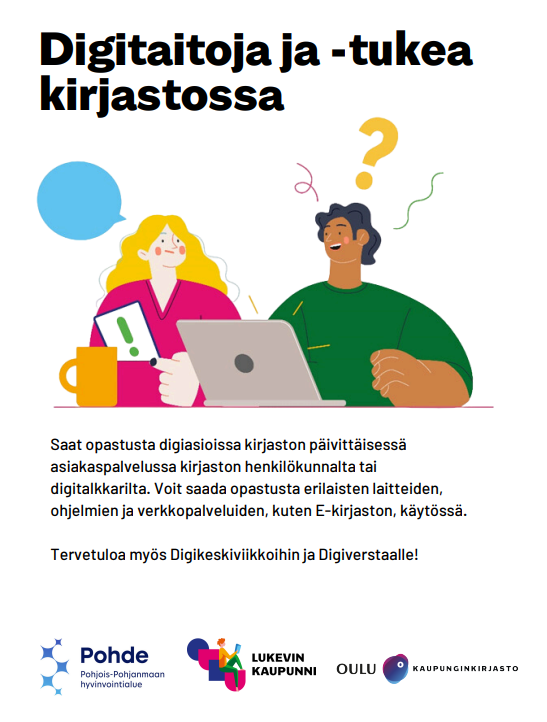 Saat opastusta digiasioissa kirjaston päivittäisessä asiakaspalvelussa kirjaston henkilökunnalta. Voit saada opastusta erilaisten laitteiden, ohjelmien ja verkkopalveluiden käytössä. Kirjaston henkilökunta ei osallistu vahvaa tunnistautumista vaativien verkkopalveluiden käyttöön asiakkaan kanssa lukuun ottamatta E-kirjaston palvelujen opastamista.