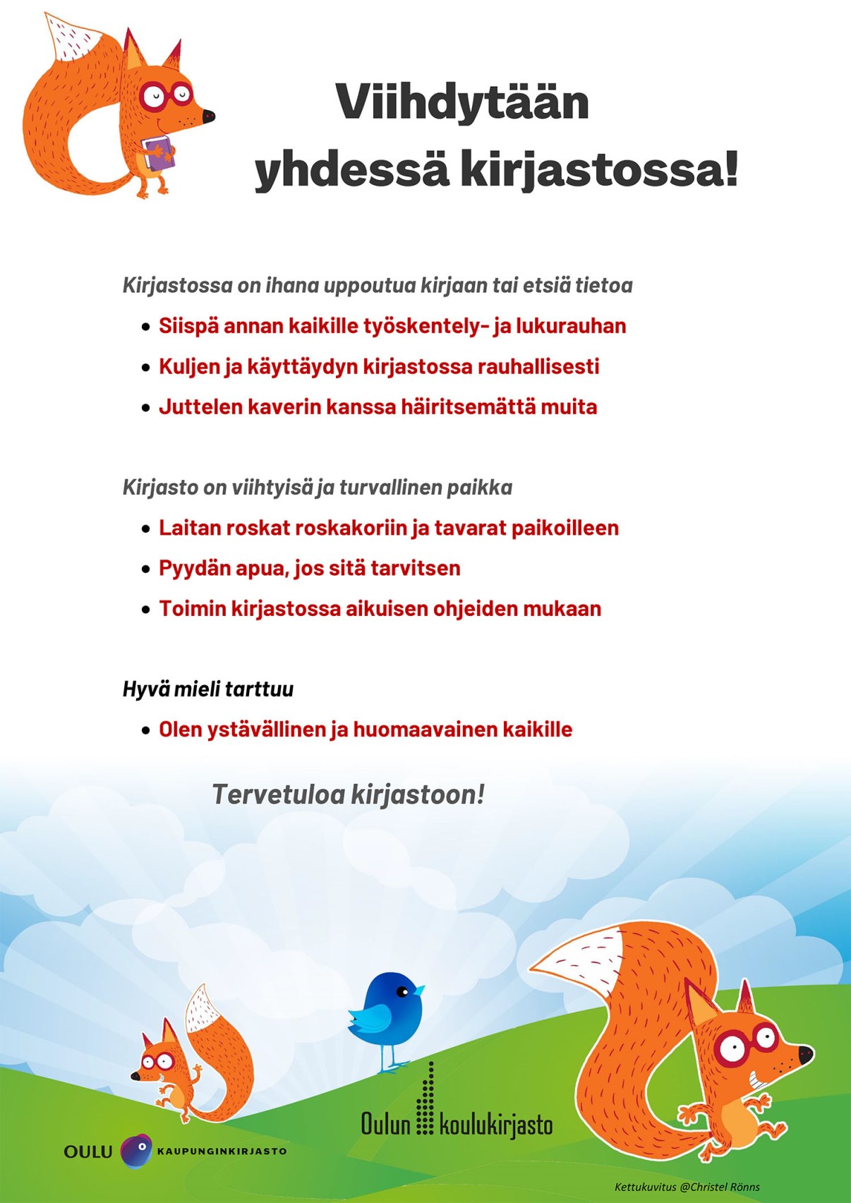 Oulun kaupunginkirjastolla ja Oulun koulukirjastoilla on yhteiset ohjeet lapsille kirjastossa toimimiseen. Tulosta ohjeet kirjaston tai luokan seinälle. Edistetään kaikkien viihtyvyyttä kirjastoissa!