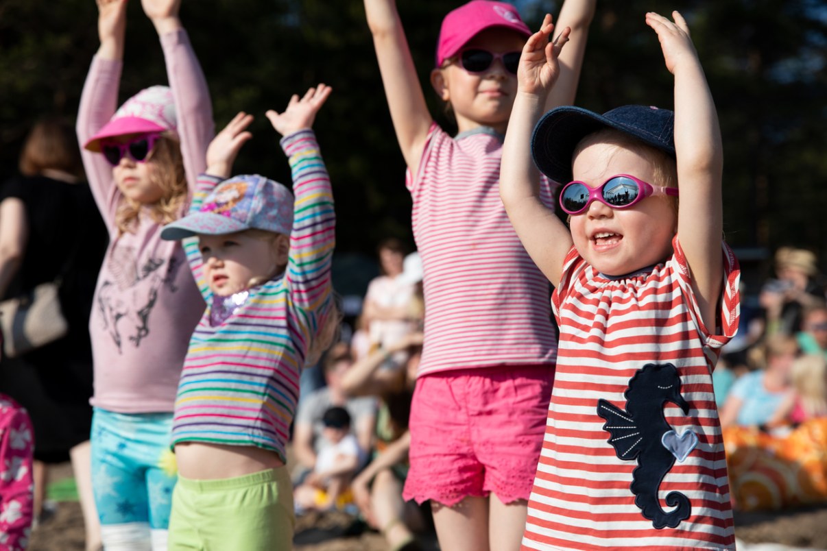 Ylhäältä kuvattu valokuva, jossa neljä lasta ja yksi aikuinen leikkivät lattialla kädet kohti kattoa.