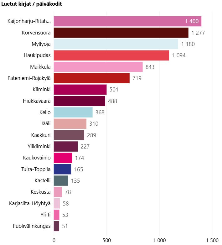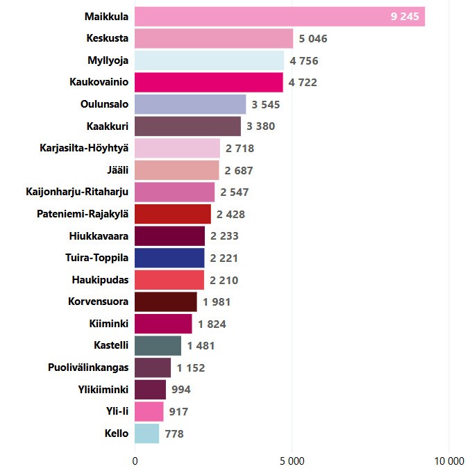 Lukumittari mittaa luettujen kirjojen määrää myös Oulun asuinalueiden välillä. Alla olevassa kuvaajassa näet aluetilanteen. 9.12.2025 tilanteessa ylivoimaisessa johdossa on edelleen Maikkulan alue. Toiseksi on noussut Keskusta, kolmantena on Kaijonharju-Ritaharju, neljäntenä Myllyoja ja viidenneksi on noussut Korvensuora. Yleisen kuvaajan alla näet myös koulujen ja päiväkotien kuvaajat.