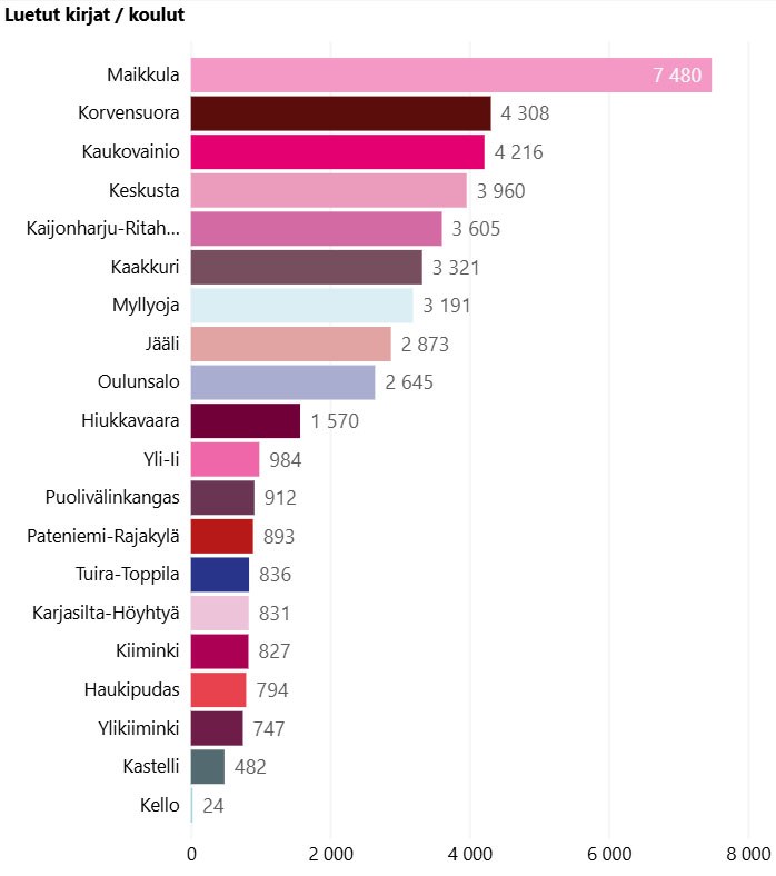 Koulujen kymmenen kärki 9.12.2025: Maikkula (7480 luettua kirjaa), toiseksi on noussut Korvensuora (4308), kolmantena on Kaukovainio (4216), neljäntenä on Keskusta (3960) ja viidentenä Kaijonharju-Ritaharju (3605). Seuraavina tulevat Kaakkuri (3321), Myllyoja (3191), Jääli (2873), Oulunsalo (2645) ja Hiukkavaara (1570).
