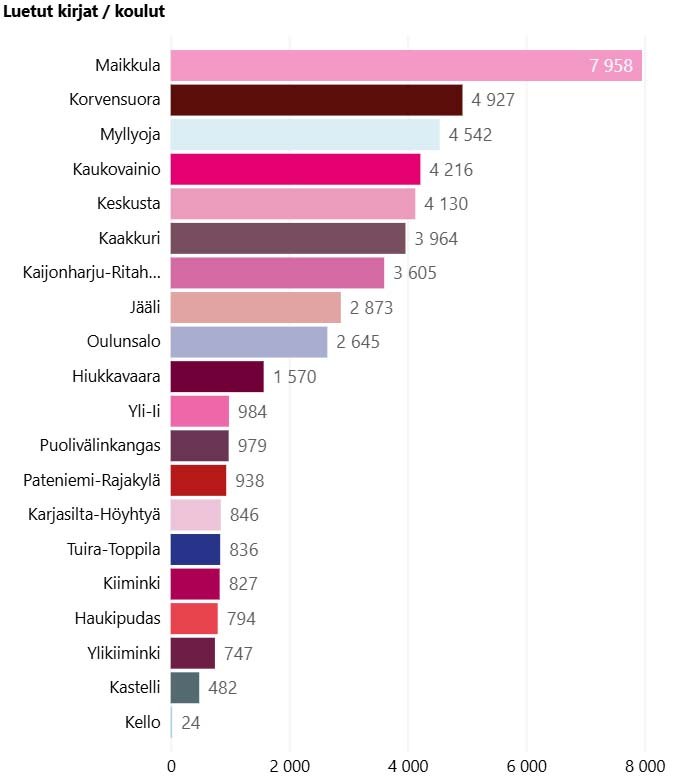 Koulujen kymmenen kärki 9.1.2026: Maikkula (7958 luettua kirjaa), toiseksi on pysytellyt Korvensuora (4927), kolmanneksi on noussut Myllyoja (4524), neljäntenä on Kaukovainio (4216) ja viidentenä on Keskusta (4130). Seuraavina tulevat Kaakkuri (3964), Kaijonharju-Ritaharju (3605, Jääli (2873), Oulunsalo (2645) ja Hiukkavaara (1570).