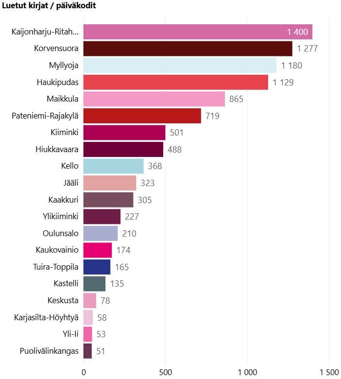 Päiväkotien kymmenen kärki on säilynyt samana: Kärjessä on Kaijonharju-Ritaharju (1400 luettua kirjaa), toisena Korvensuora (1277), kolmantena Myllyoja (1180), neljäntenä Haukipudas (1129) ja viidentenä Maikkula (865). Seuraavina tulevat Pateniemi-Rajakylä (719), Kiiminki (501), Hiukkavaara (488), Kello (368) ja Jääli (323).