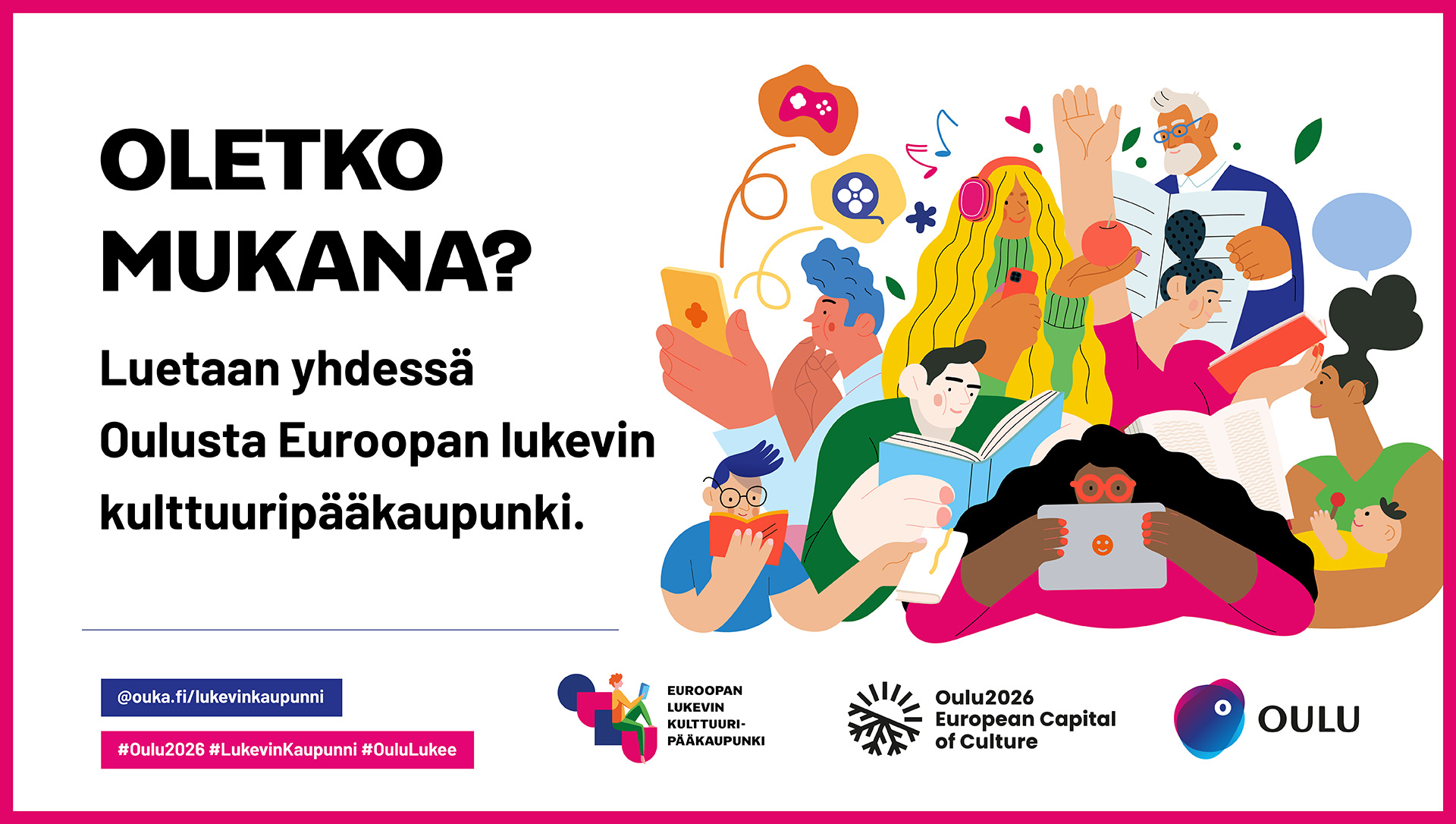Somessa käytetään hästägejä #LukevinKaupunni #OuluLukee #EuroopanLukevinKulttuuripääkaupunki #Oulu2026 ja tägää @oulunkaupunginkirjasto.
