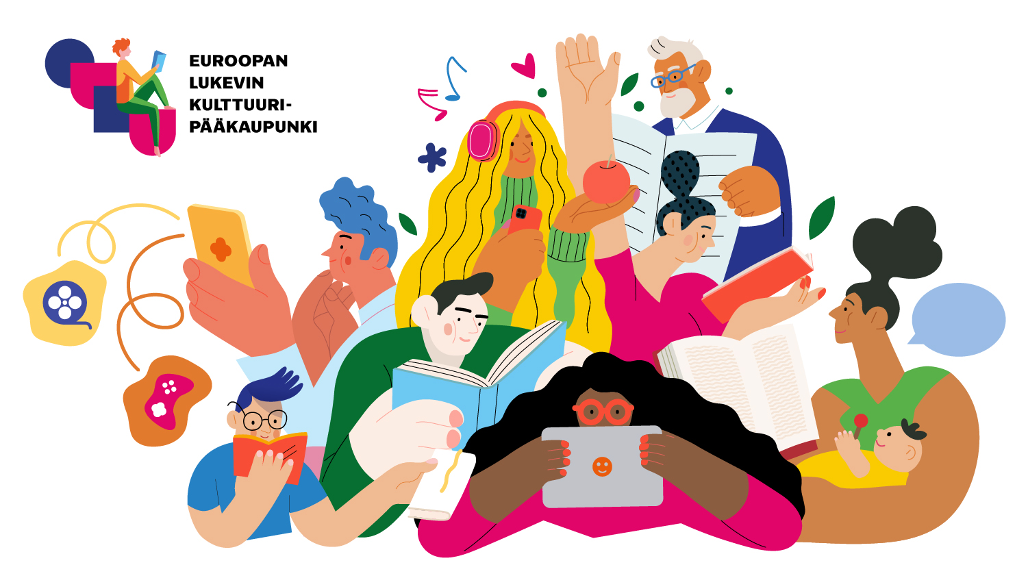 Lukevin kaupunni -markkinointimateriaalien avulla voit kertoa olevasi mukana lukutaitotyössä ja käyttää materiaaleja oululaisen lukutaitoon tai lukemiseen liittyvän toiminnan markkinointiin ja viestintään. Tavoitteena on tehdä oululaisten lukemista ja lukutaitotyötä näkyväksi ja kertoa, millainen on Euroopan Lukevin kulttuuripääkaupunki!