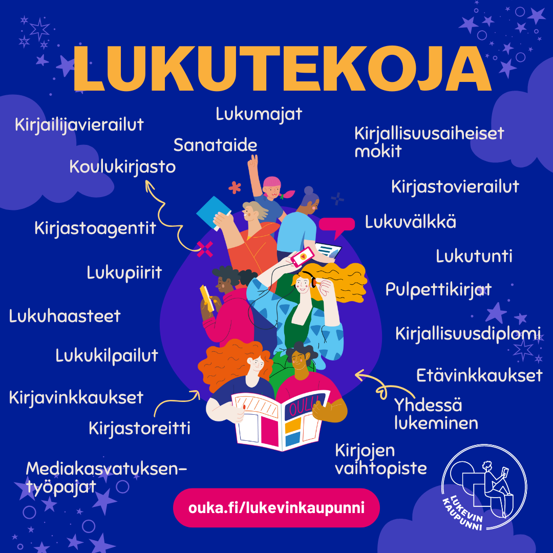 - Osallistukaa Oulun kaupunginkirjaston Kirjastoreitti-toimintaan. Kirjastoreitissä on ohjattuja ryhmäkäyntejä ja verkkomateriaaleja. Kirjastoreitti-sivuilta löydät tarkemmat, luokkakohtaiset sisällöt. Muista myös Oulun kaupungin kirjallisuusdiplomi ja Kirjastoreitin lukuhaasteet.