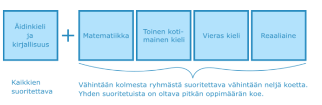 Ylioppilastutkintoon on sisällytettävä vähintään viiden tutkintoaineen kokeet. Kaikkien kokelaiden on sisällytettävä tutkintoonsa äidinkielen ja kirjallisuuden koe. Lisäksi tutkintoon on sisällytettävä vähintään neljä eri tutkintoaineen koetta vähintään kolmesta seuraavasta ryhmästä: matematiikka, toinen kotimainen kieli, vieras kieli ja reaaliaine. Kokeisiin tulee sisältyä vähintään yksi pitkän oppimäärän koe.