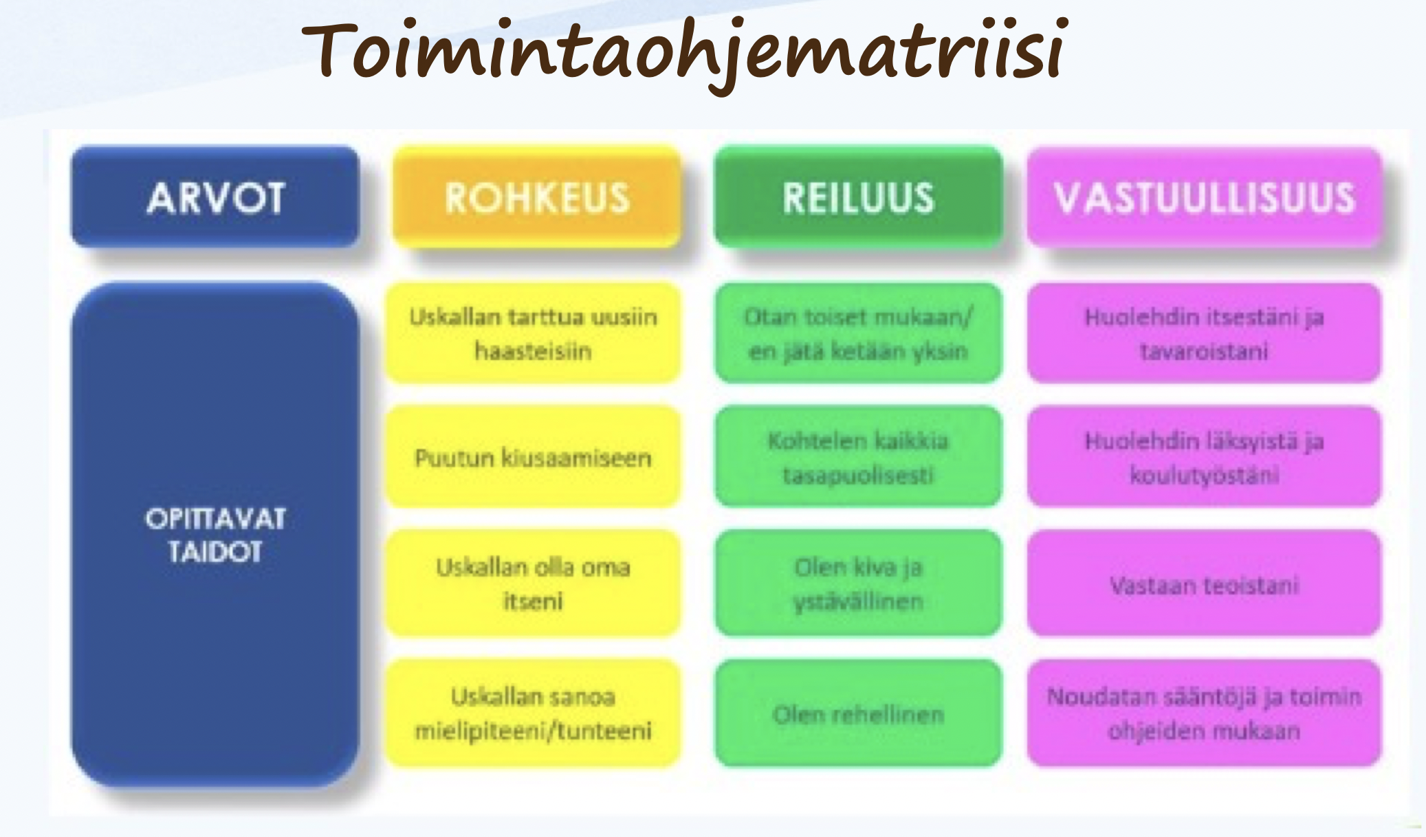 - Hyvinvointityömme toimintaohjematriisi (erityisesti dia 9) esittelee koulumme hyvinvointityön rakennetta ja sisältöjä.