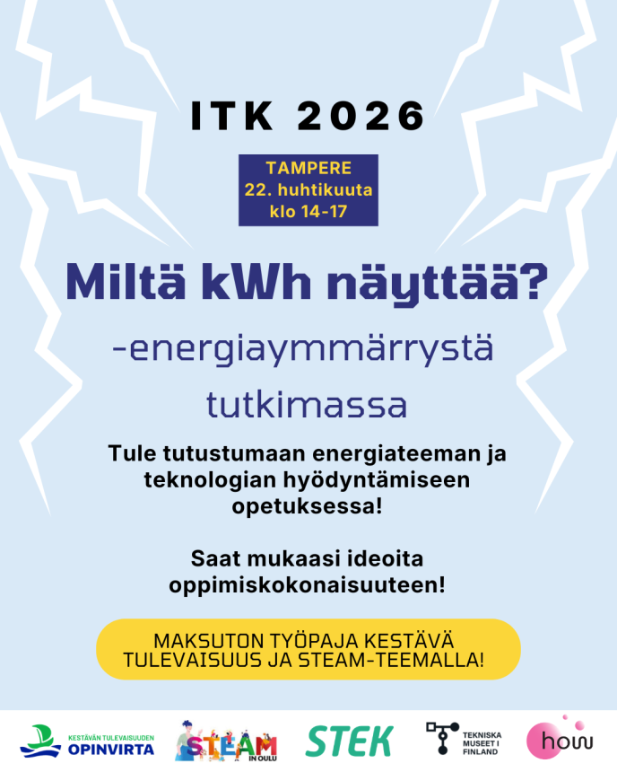 Julkaisemme Energiansäästöviikolla kouluille, varhaiskasvatuksen yksiköille ja työyhteisöille haasteen ”Miltä kWh näyttää?”. Tietoa kampanjasta saat myös seuraamalla Opinvirran, STEAMinOulun sekä varhaiskasvatuksen virallisia somekanavia sekä ensi maanantaina Akkunassa julkaistavasta uutisesta. Kampanjaan liittyen on jaettu energiavinkkauksia liikkumisen, ruoan sekä digitalisaation näkökulmasta. Haaste on voimassa marraskuun loppuun. Se on osa Sivistys- ja kulttuuripalveluiden saman nimistä hanketta ja se toteutetaan yhteistyössä Oulun kaupungin toimijoiden kanssa.