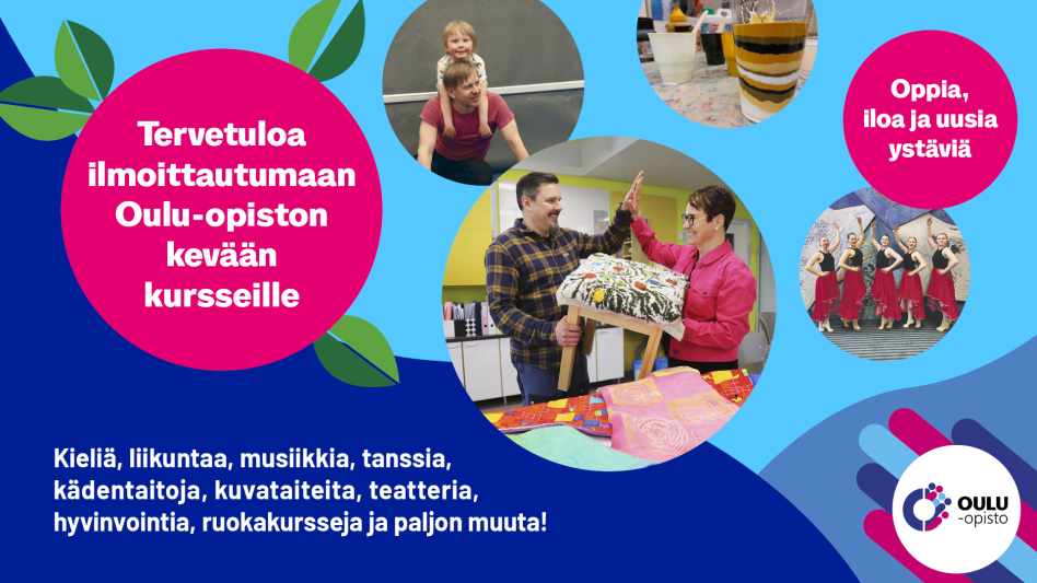 Oulu-opistolta löydät oppia, iloa ja uusia ystäviä! Oulu-opisto on Oulun kaupungin omistama, kaikille avoin oppimisen ja harrastamisen paikka. Meillä voit kehittää itseäsi elämän eri vaiheissa – asuinpaikasta riippumatta. Toimintaamme ohjaavat rohkeus, reiluus, vastuullisuus ja hyvinvointi. Oulu-opisto on neljänneksi suurin kansalaisopisto Suomessa. Tervetuloa mukaan!