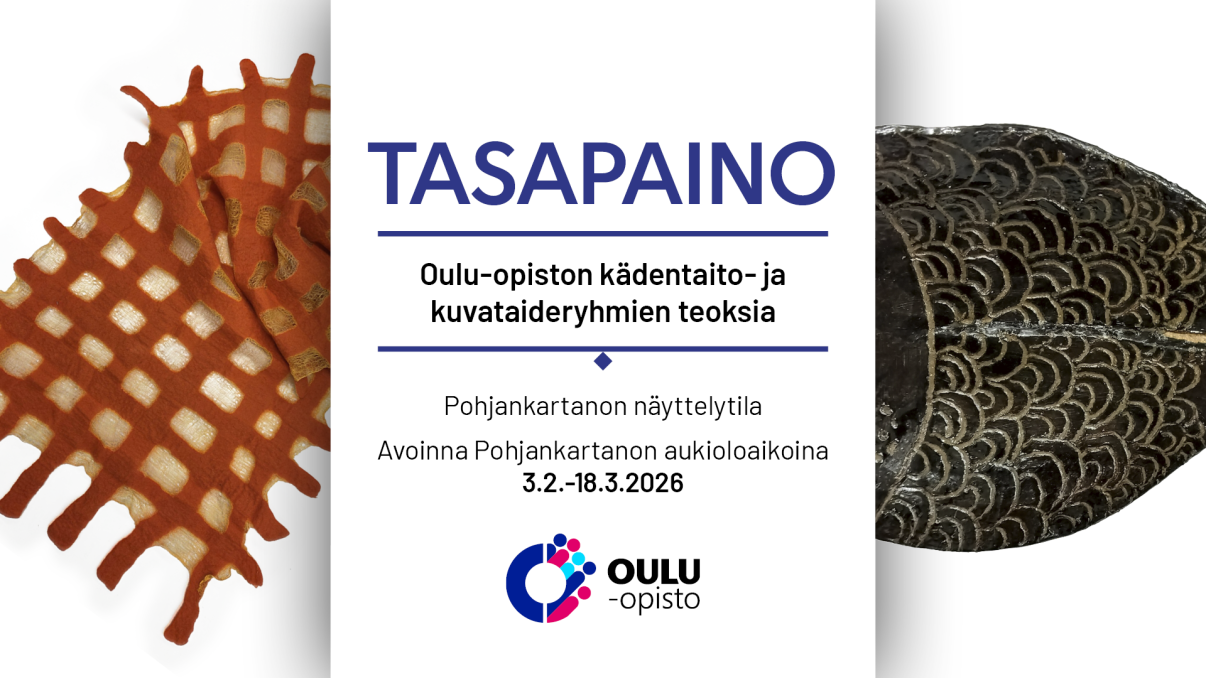 Näyttelyssä toisiaan tasapainottavat lukuvuoden 2025–2026 aikana Oulu‑opiston kädentaitojen ja kuvataiteen kursseilla valmistuneet teokset. Kuvataiteen puolelta nähdään muun muassa lasinsulatusta, keramiikkaa, piirustuksia ja maalauksia. Kädentaitojen osuus tarjoaa laajan kattauksen teoksia pehmeistä materiaaleista aina koviin käsityön menetelmiin. Näyttely on kaikille avoin ja maksuton, tervetuloa!
