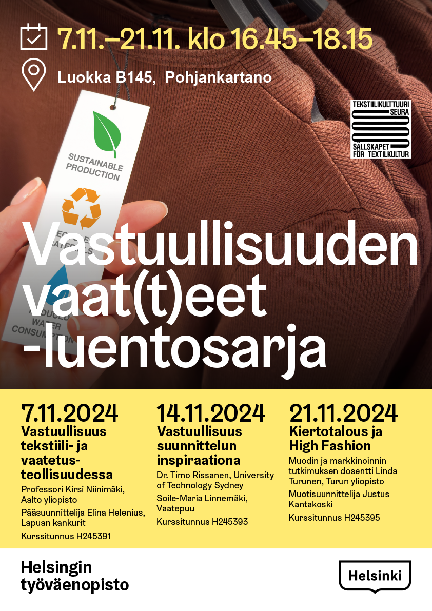 Tervetuloa marraskuussa Pohjankartanolle seuraamaan yhteistyöluentosarjaa Helsingin työväenopiston ja Tekstiilikulttuuriseuran kanssa. Luentosarjan kantavana teemana on vastuullisuuden kietoutuminen tekstiili- ja vaatesuunnitteluprosessiin. Aihetta lähestytään teorian ja käytännön kautta sekä eri ammattilaisten näkökulmasta.