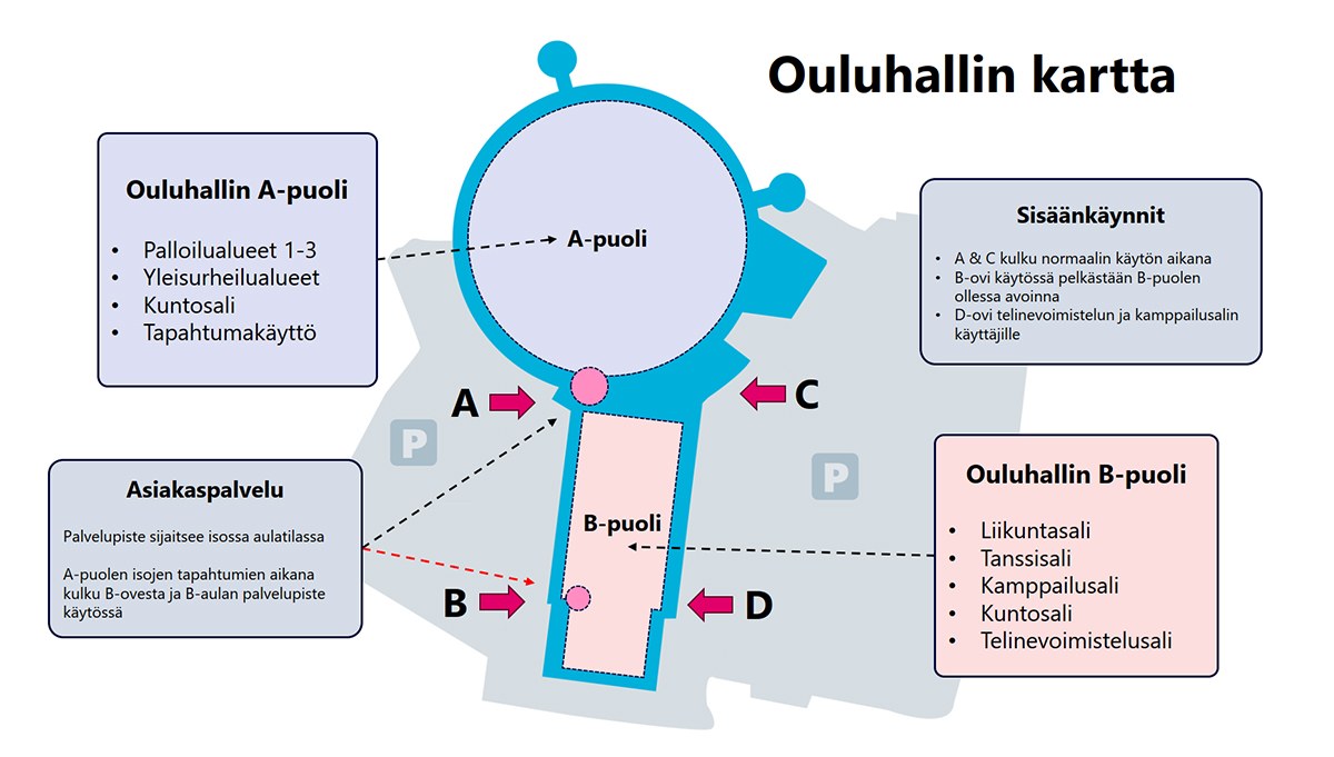 A-puolella tarkoitetaan Ouluhallin kupoliosaa ja B-puolella laajennusosaa.