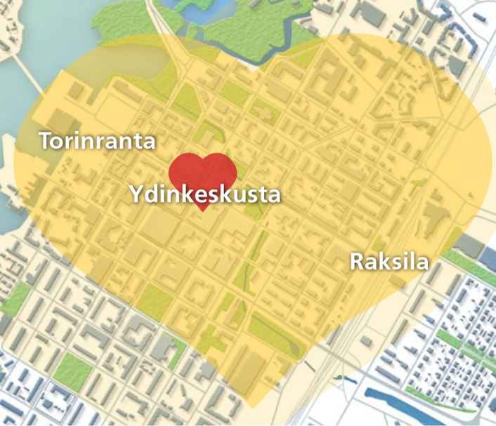 Suunnitelmassa kaupunkikeskustalle määriteltiin keskustan elämyksellisen kehittämisen päävyöhyke Raksilasta ydinkeskustan kautta Torinrantaan, joka nimettiin ”elämän langaksi”.