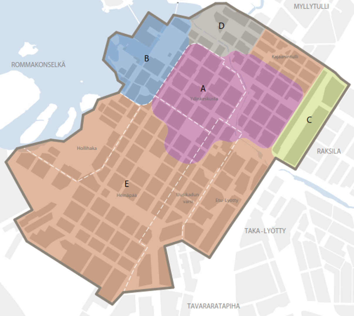 Historiallinen keskusta (D) sisältää Tuomiokirkon ja Franzeninpuiston. Asumisen keskusta (E) kattaa Heinäpään, Hollihaan, Etu-Lyötyn, Uusikadun varren ja Kajaanintullin.