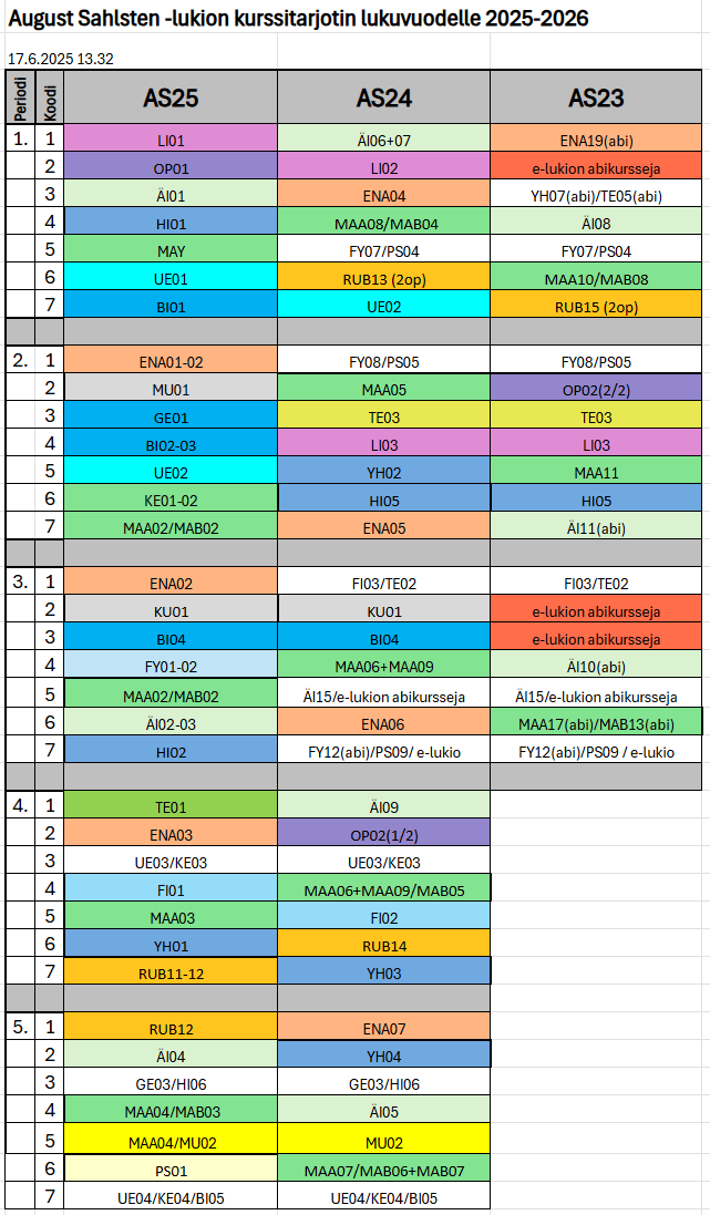 | Päättöviikko | Periodi päättyy päättöviikkoon (periodin 7,5 viimeistä työpäivää), jonka aikataulu poikkeaa tavanomaisesta tuntikierrosta. AS-lukiolla päättöviikko alkaa edellisen periodin viimeisenä työpäivänä, jolloin klo 8.15-11.15 on lukujärjestyksen mukaista opetusta ja klo 12-15 2-koodin opetusta. Sen jälkeen päättöpäivät menevät koodijärjestyksessä 1-koodista 7-koodiin. Kunakin päättöpäivänä on viisi tuntia erilaista toimintaa (kertausta, esityksiä, laboratoriotöitä, kokeita, tms.) sisältäen myös ruokailun. |