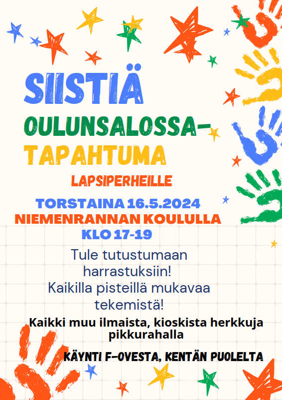 Siistiä Oulunsalossa-tapahtuma lapsiperheille to 16.5.2024 Niemenrannan koululla 07.05.2024 Toiminnalliset pisteet ja lisätietoa tapahtumasta
