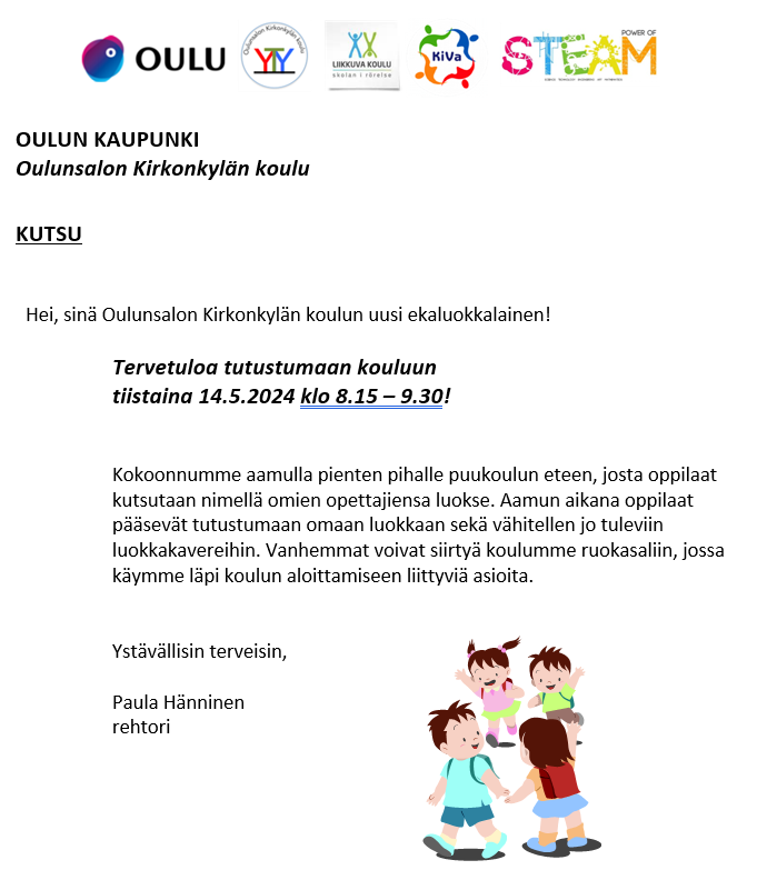 Tulevien ekaluokkalaisten kouluun tutustuminen ti 14.5.2024 klo 8.15 - 9.30 (materiaalit lisätty) 12.04.2024 Tervetuloa kouluun infon 14.5.2024, materiaali pdf 460.89 KB