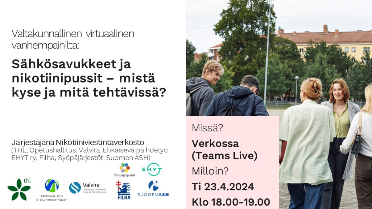 Valtakunnallinen virtuaalinen vanhempainilta ti 23.4.2024: Sähkösavukkeet ja nikotiinipussit – mistä kyse ja mitä tehtävissä?