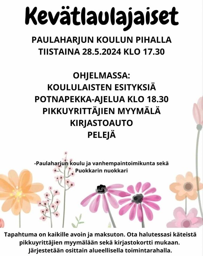 Kevätlaulajaiset 28.5.2024 22.05.2024 Kevätlaulajaiset Paulaharjun koulun pihalla tiistaina 28.5.2024 klo 17.30.Tervetuloa!