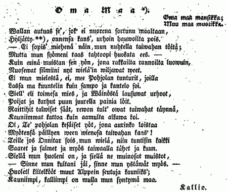 Bergh julkaisi Oma maa -runosta oman versionsa Oulun Wiikko-Sanomissa 19.4.1834.