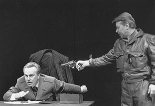 Puolitoista pudotusta esitettiin Oulun kaupunginteatterin pienellä näyttämöllä keväällä 1990. Rooleissa nähtiin muun muassa yllä olevassa kuvassa olevat Heimo Happonen ja Risto Salminen.