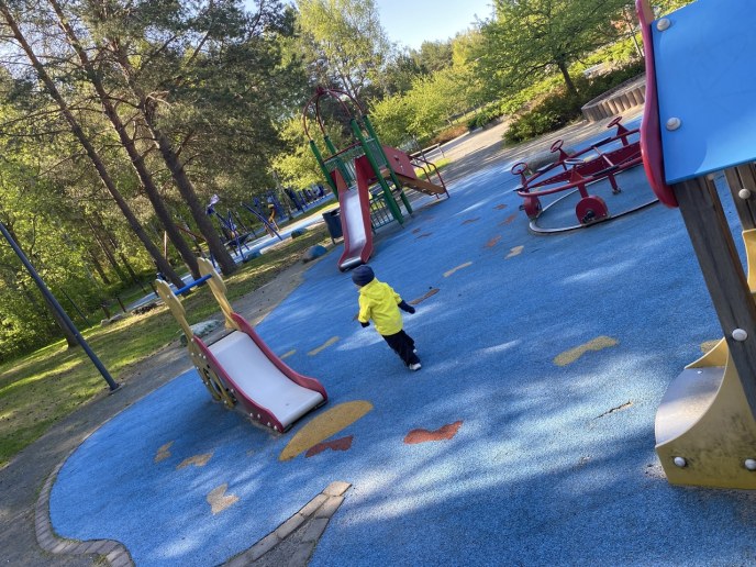Keinujen, hiekkaleikkipaikan, jousieläinten, pienten liukumäen ja kiipeilytelineen lisäksi puistossa on