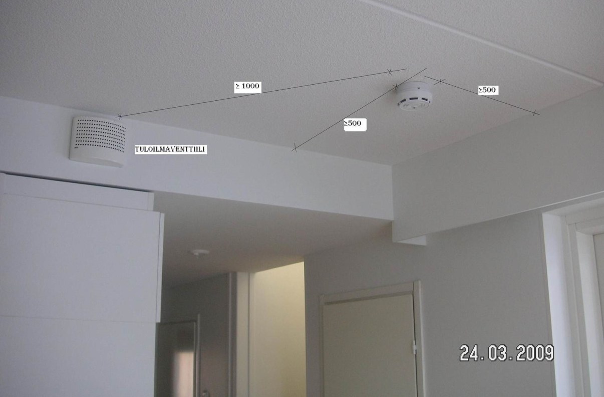 Palovaroittimen on oltava katossa vähintään 500 mm seinästä. Jos se on nurkassa, niin vähintään 500 mm molemmista seinistä. Sen lisäksi etäisyys tuloilmaventtiilistä on oltava vähintään 1 m. (Tulipalotilanteessa seinän ja katon muodostamaan nurkkaukseen jää kolmion muotoinen raittiin ilman vyöhyke ja sinne sijoitettu palovaroitin ei toimi palon alkuvaiheessa. Tuloilmaventtiilistä tulee aina pölyä, joka tukkii varoittimen herkän anturin. Sen lisäksi tuloilmaventtiilistä tuleva raitis ilma hämää kyseistä anturia.)